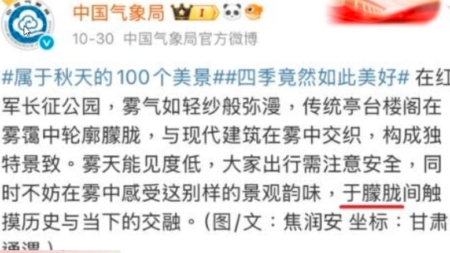 此外,11月25日,杭州西溪國家濕地公園官方微博也在帖文中寫道:「木橋隱于朦朧。」10月30日,中國氣象局在微博發文,帖文在描述霧天的天氣狀況時,突然冒出一句:「于朦朧間觸摸歷史與當下的交融」。