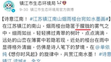 9月30日,江蘇鎮江市生態管理局發文:「煙雨樓台隱匿于朦朧的霧氣之中。」