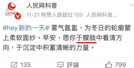 網頁截圖顯示,11月21日,中共黨媒「人民網」旗下的「人民網科普」發布寫景帖文,其中一句「早安,願你于朦朧中看清方向」最引人關注。這句話似乎很巧妙地將「于朦朧」三字嵌入其中,許多網民直呼「太巧、太敏感」。