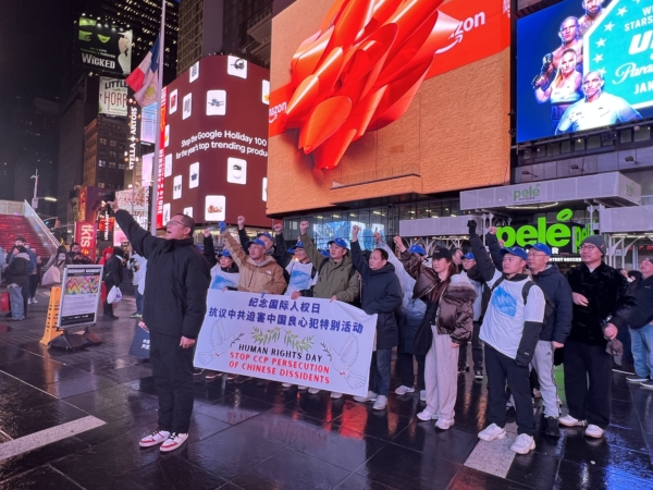 12月10日「世界人權日」夜晚,旅居美國的中國民主黨部份黨員聚集到紐約時代廣場的紅色台階前,在這個著名的「世界十字路口」處,向全世界發出他們的心聲:人權天賦!中共剝奪人權!打倒中國共產黨!自由中國!