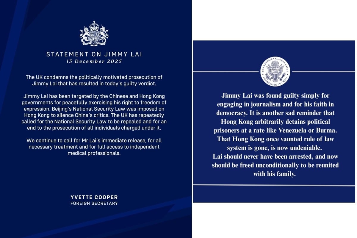 壹傳媒創辦人黎智英今日(15日)被裁定「串謀勾結外國勢力」及「串謀發布煽動刊物」罪成。英國外相顧綺慧(Yvette Cooper)發聲明,稱英國譴責針對黎智英的政治檢控,並譴責作出的有罪裁決。