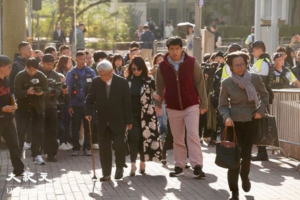 黎智英聽判時神情平靜。今天上午,黎智英的妻子李韻琴與幼子黎順恩、天主教香港教區前主教陳日君、前社民連成員曾建成、前香港民主黨主席劉慧卿,美國、英國、加拿大等多國領事館人員均現身法庭外,準備進入法庭旁聽。