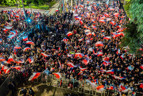 支持者14日晚抵達位於聖地牙哥的卡斯特競選總部,揮舞智利國旗。23歲的工程系學生塞戈維亞(Ignacio Segovia)說:「我成長於一個和平的智利,那時走在街上毫無顧慮,出門在外不會遇到麻煩或害怕。而現在,你無法安心出門了。」