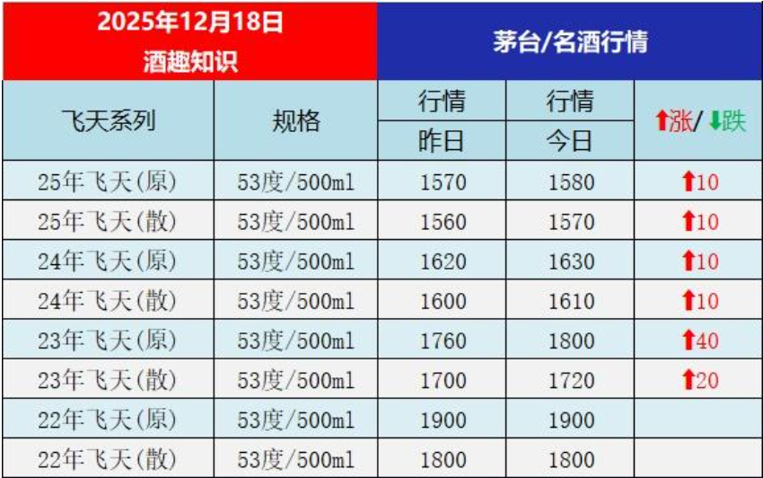 據今日酒價消息顯示,12月18日,飛天茅台價格有所回升,上升幅度約為每瓶10元。#