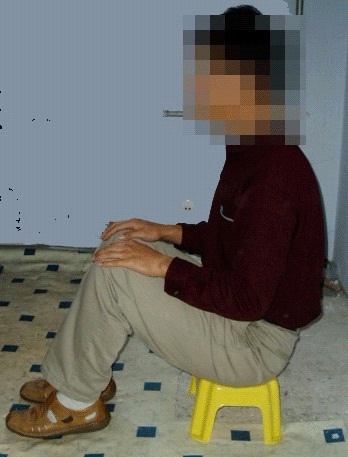 罰坐小凳是一種酷刑手段,受害者必須雙手放在膝蓋上,身子一動不動,一動就挨打挨罵。由於長期坐小凳子,許多法輪功學員臀部、陰部皮膚糜爛、流膿,坐出老繭。出現雙下肢水腫、血壓增高、心血管等多器官疾病。