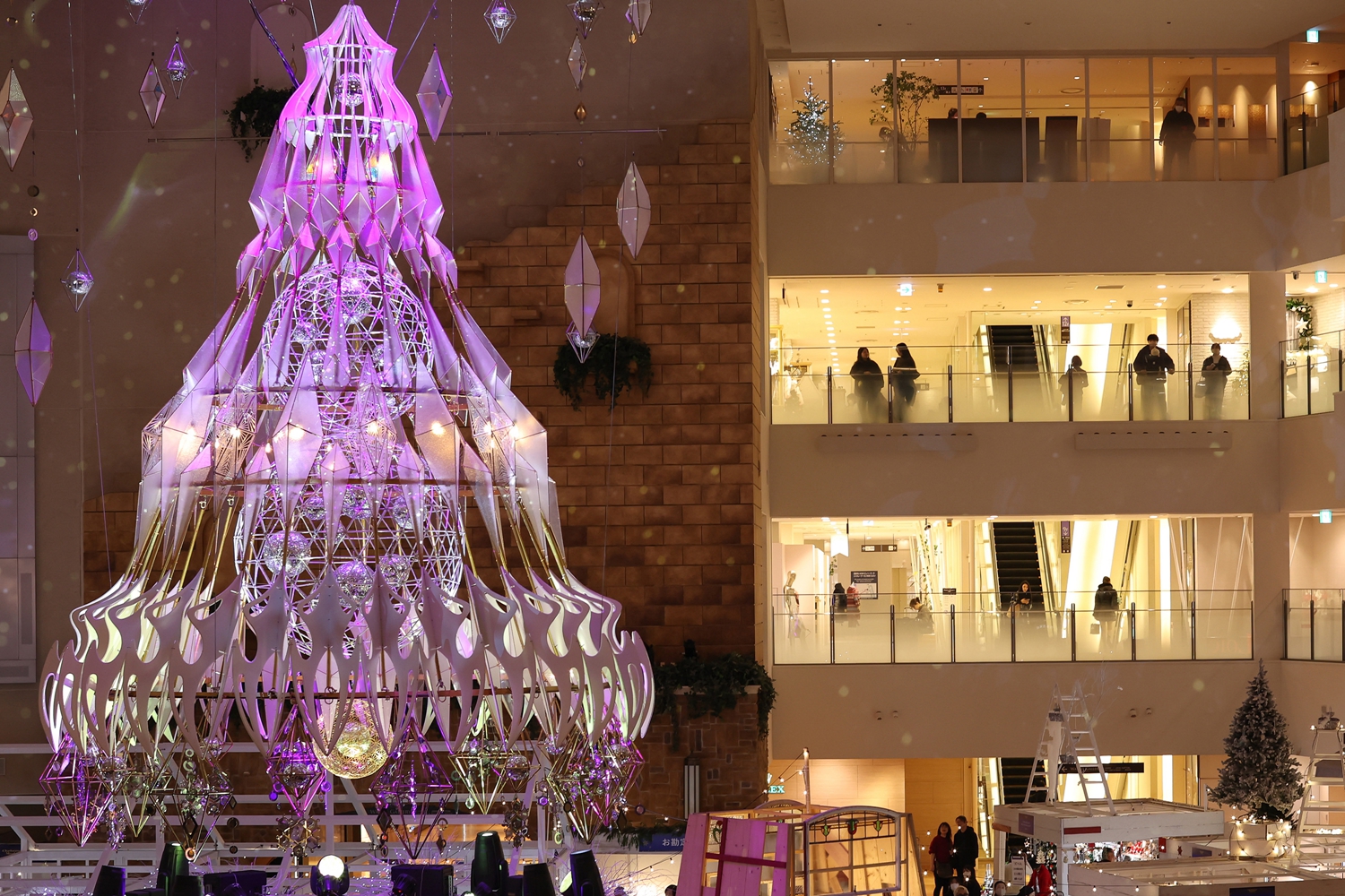 2025年12月18日,在日本大阪聖誕購物季期間,阪急百貨店(Hankyu department store)內布置的一棵華麗的巨型聖誕樹。(Buddhika Weerasinghe/Getty Images)