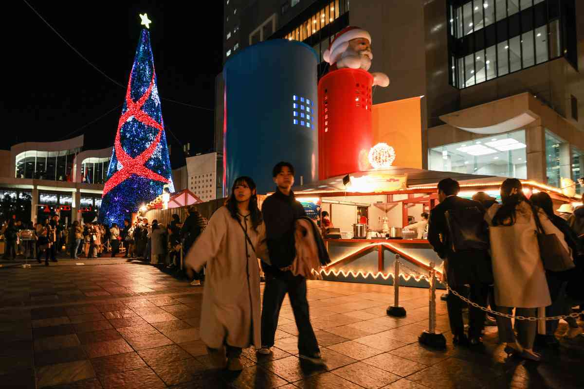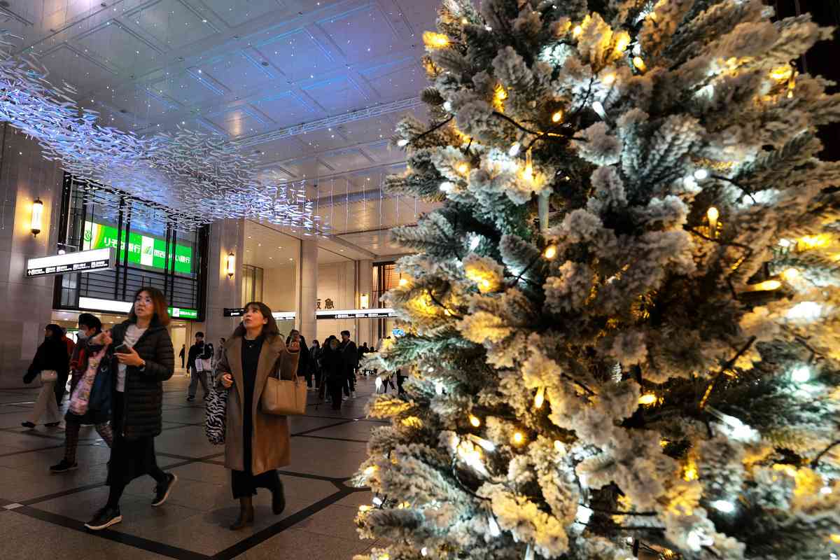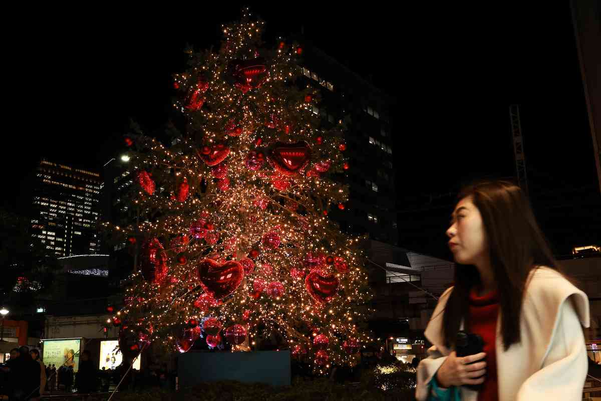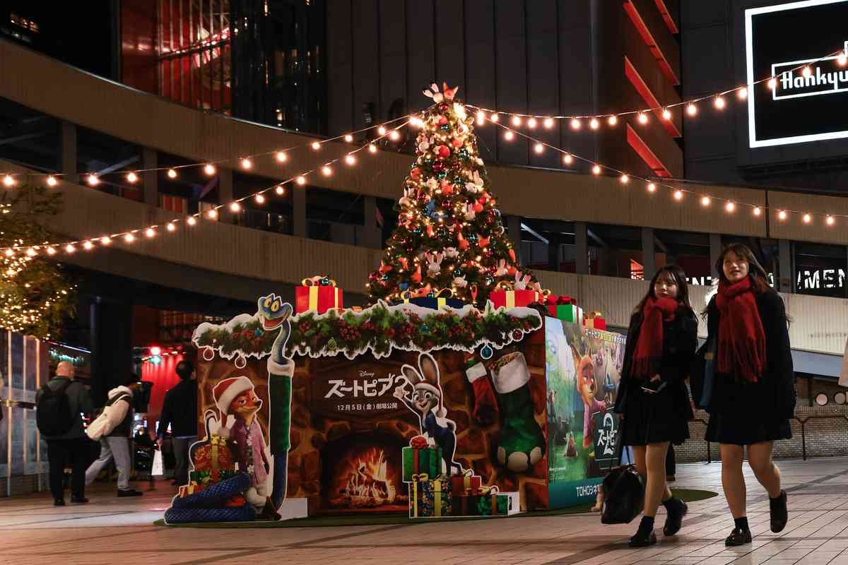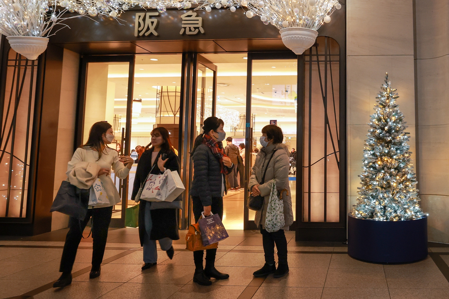 2025年12月18日,在日本大阪聖誕購物季期間,購物者站在阪急百貨店(Hankyu department store)外的一棵聖誕樹旁。(Buddhika Weerasinghe/Getty Images)