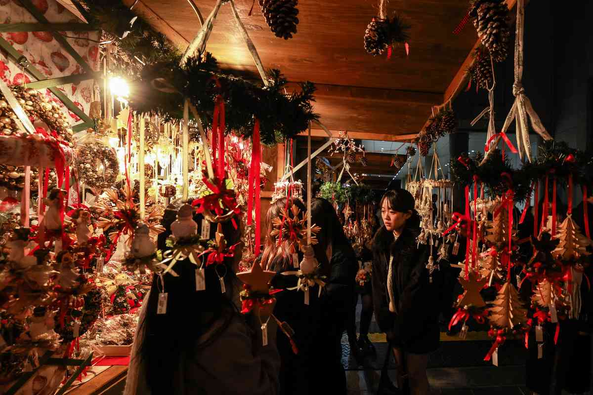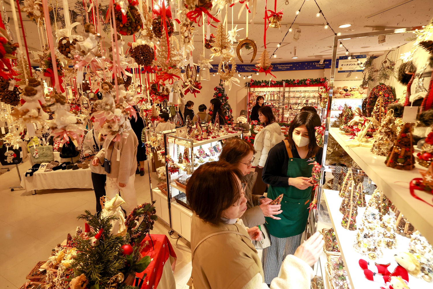 2025年12月18日,在日本大阪聖誕購物季期間,購物者在逛阪急百貨店(Hankyu department store)的室內聖誕市場。(Buddhika Weerasinghe/Getty Images)