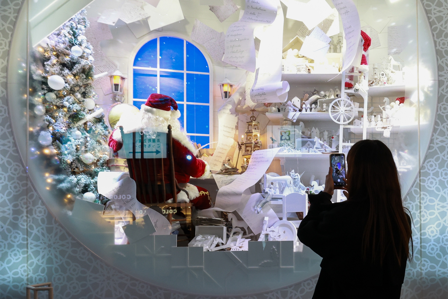 2025年12月18日,在日本大阪聖誕購物季期間,一名女子在阪急百貨店(Hankyu department store)內,拍攝一處布置精美的聖誕櫥窗。(Buddhika Weerasinghe/Getty Images)