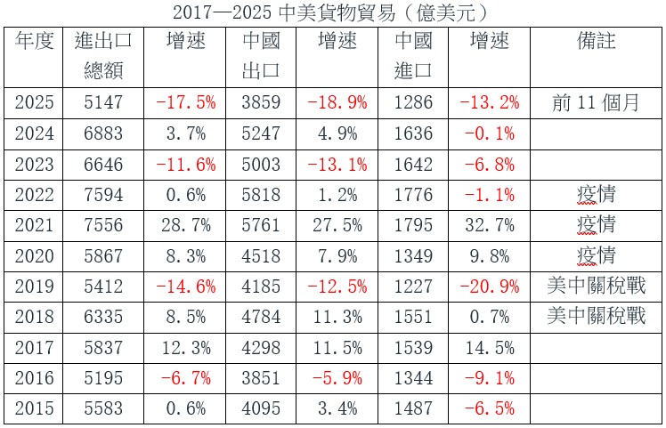 2025年,特朗普再主白宮,美中較量顯著升級。根據中共海關數據,1-11月美中雙邊貨物貿易,三項數據呈兩位數下降。這不論是與同期的中國全球貨物貿易相比(中國出口增5.4%、進口減0.6%,進出口總額增2.9%),還是與中美貨物貿易歷史數據相比(見下表),都是慘澹的。