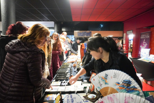 中場和散場之後,劇院的商品區人頭攢動,水洩不通,神韻商品攤位和法輪大法書籍攤位前,圍了裏三層外三層的觀眾。