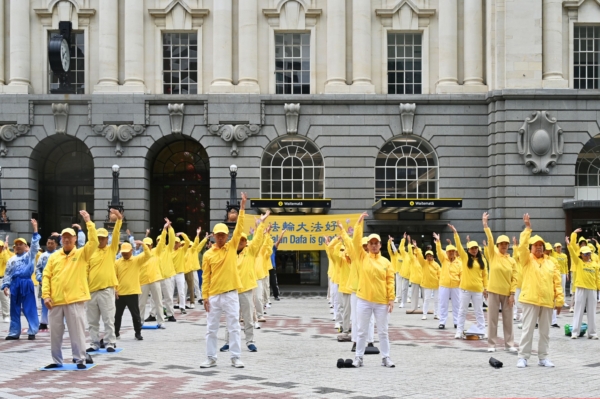 活動當天,伊利沙伯女王廣場上巨大的聖誕樹彩蛋閃耀,遊客絡繹不絕。上午10時許,舒緩的煉功音樂響起,約70名法輪功學員身著統一服裝,進行集體煉功。整齊壯觀的場面引來民眾紛紛駐足、拍照與留影。