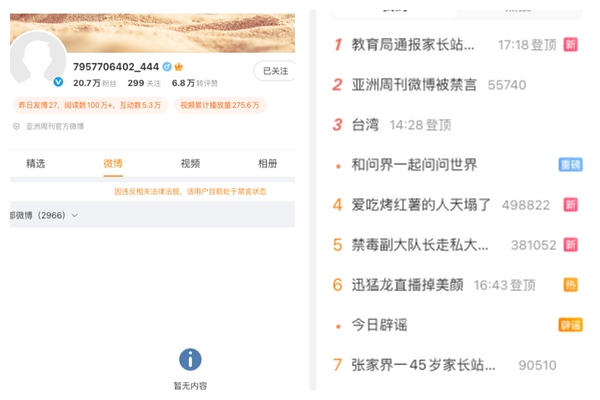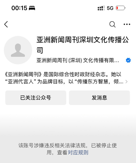 12月30日,擁有20.7萬粉絲《亞洲周刊》微博帳號的名稱變成一串數字,所有微博內容被清空,帳號頁面顯示,「因違反相關法律法規,該用戶目前處於禁言狀態」,微博搜索入口找不到該帳號。