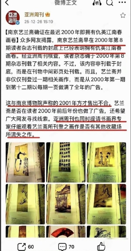 12月26日,《亞洲周刊》發文說,南京藝蘭齋確證在最遲2000年即擁有仇英《江南春》畫卷,經其核查,《讀者雜誌》2000年第8期中間彩頁處刊載了相關內容,而且,2000年第一期到第十二期,藝蘭齋每期一頁,做了全年廣告。