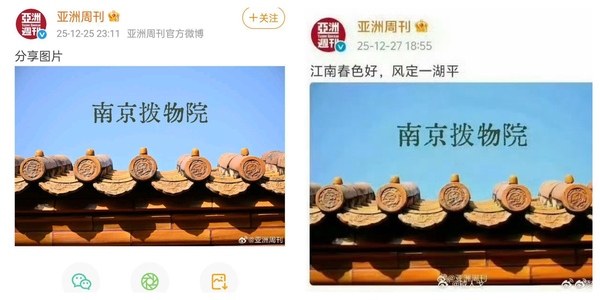 12月25日,《亞洲周刊》分享一張別具深意的圖片,圖片將「南京博物院」喻為「南京撥物院」,並於27日再次轉發,還配以「江南春色好,風定一湖平」,似暗諷徐湖平在文物流失上扮演的角色。