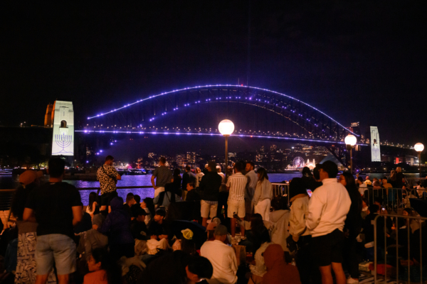 2025年12月31日,在現場觀看新年跨年煙花秀的觀眾打開手機電筒,聲援猶太社區。(Saeed Khan/AFP via Getty Images)