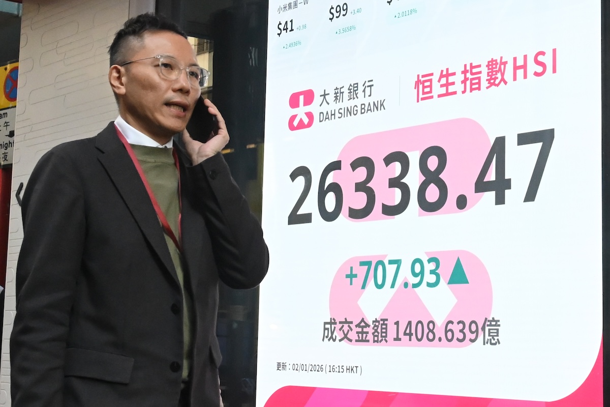 亞太區股市大多於開年日造好,韓股大漲2.3%、台股抽高1.3%,港股亦顯著高收。恒指今(2日)早高開86點,隨後持續上攀,收市報26,338點,勁升707點(即漲2.8%),成交額1,409億。國指升2.9%、科指走高4.0%。