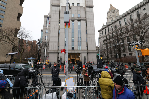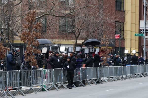 法院內,身穿美國法警署防風夾克和戰術裝備的人員在大廳巡邏。法院外,數十人排起了長隊,其中包括記者和付費排隊人員,他們都想進入法庭。有些人自帶帳篷、座椅和暖手寶,以應對漫長的等待和嚴寒。
