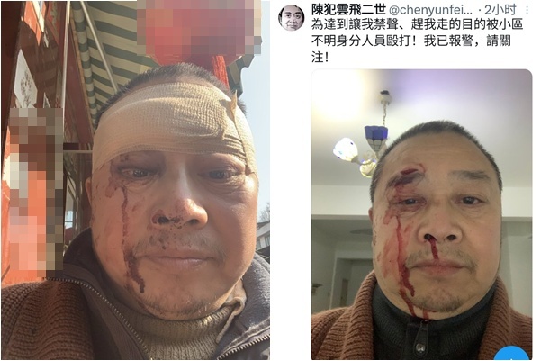 知情人王浩(化名)1月9日對《大紀元》表示,事發時,陳雲飛和往常一樣推著90歲的母親到樓下散步,突然一不明身份男子衝上來,一邊大聲叫罵質問了幾個問題,一邊暴打陳雲飛,並揚言:「不要在社交平台X上發帖」。陳雲飛沒有還手,他面部多處受傷,右眼眶上方被打出一條四厘米長的口子,縫合了四針。面部和傷口處腫脹、有瘀青。