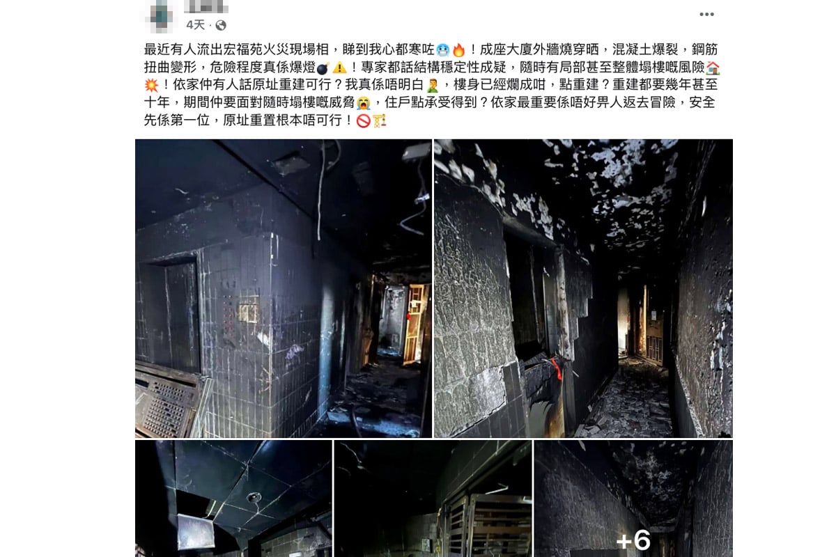 帖文形容大廈外牆已被燒穿,出現混凝土爆裂以及鋼筋扭曲變形的現象,顯示該處極危險。發帖人質疑該建築物的結構穩定性,懷疑存在局部或整體塌樓的風險。他又認為建築物主體結構損毀嚴重,若進行重建可能耗時數年甚至十年;強調應將安全放在第一位,原址重置並不可行。