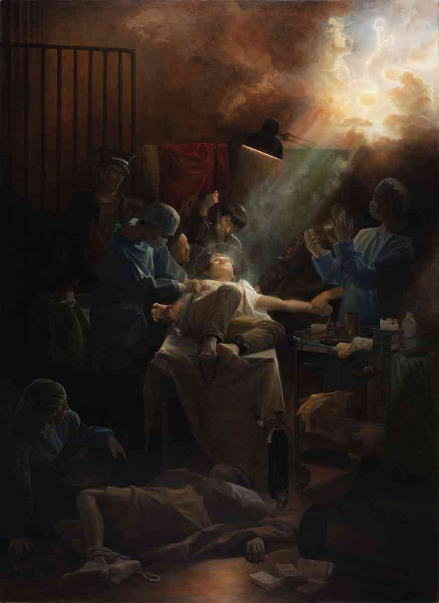 手術台四周的醫護人員戴著口罩,眼神冷漠,這反映出,專業技能被工具化,人性被徹底剝離。地上有另一名受難者被捆綁,躺在地上,而從布蓋底下的右下角流出一攤血泊,和天國世界的破口上下呼應。顯示著這種罪行並非偶然,而是流水線式的重複。