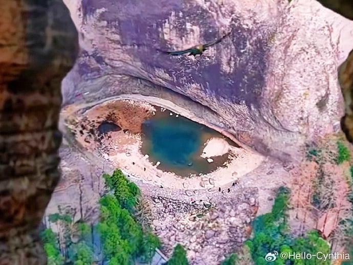 微博會員「HeIIo-Cynthia」發帖:巨山「開龍眼」了!雙眼皮清晰可見!浙江雁蕩山大龍湫景區,近日因當地持續少雨致潭水退縮,其潭底岩壁與殘存水域形成震撼的「開龍眼」奇觀:一汪深綠色潭水為「瞳孔」,周邊米色岩壁為「眼白」,上方凹陷的岩石酷似「雙眼皮」,形象十分具體與生動。
