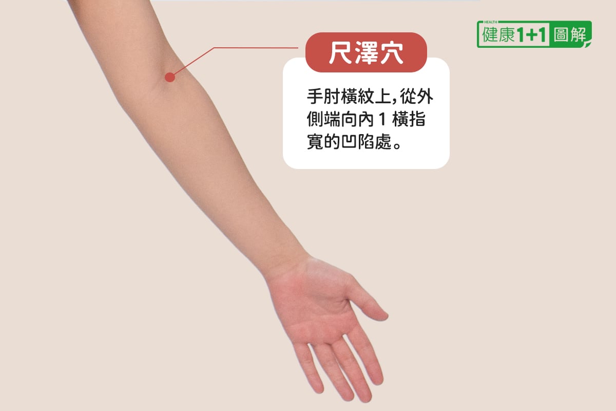 尺澤穴位於手肘橫紋靠近大拇指的一側。按壓時,用另一隻手指輕壓尺澤穴,配合肩膀與頸部的輕微晃動,就能促進氣血流通。