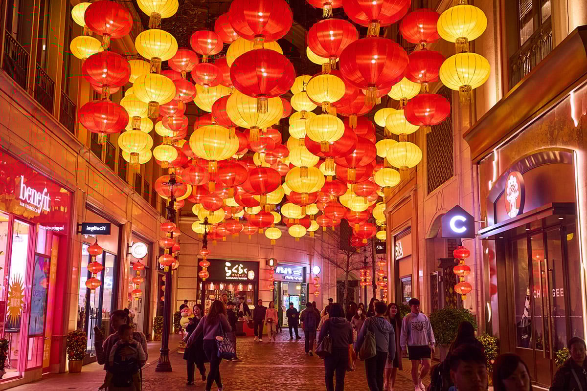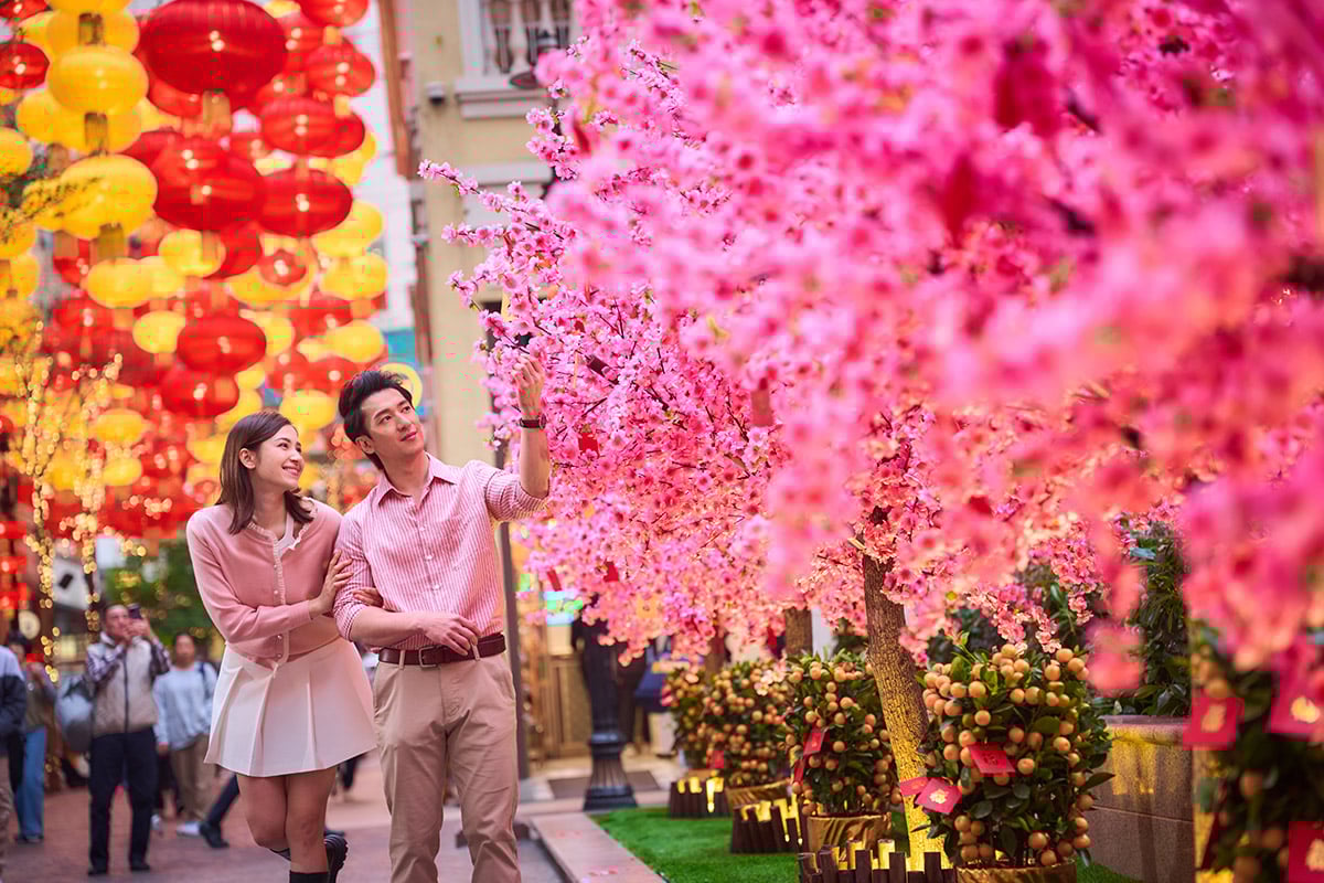 新年期間,逾800個金紅喜慶燈籠匯聚成華麗燈海,照亮約200米長的林蔭大道,寓意鴻運當頭、闔家團圓。中庭特別設置12棵近3.5米高粉紅桃花樹,築成開運庭院,為情人節及元宵佳節打造溫馨甜蜜的打卡熱點,亦寄寓情人間的幸福甜蜜與家人間的和睦圓滿。