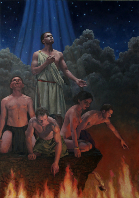 這幅畫在訴說著甚麼樣的故事?畫面從天而降、清晰的光束,創世主明確指引出一條穩定的具有希望的途徑。上方無窮無盡的宇宙與下方遼闊的火海深淵,兩者的開闊性與無限性使人物的選擇更顯重要。透過戲劇性的對比,來探討人在世間所面臨的神的救贖、人性掙扎與墮落的永恆主題。同時也見證了:在真誠面對世間的熔煉考驗作正確的選擇,人們將無盡地感恩頌揚被救度。#