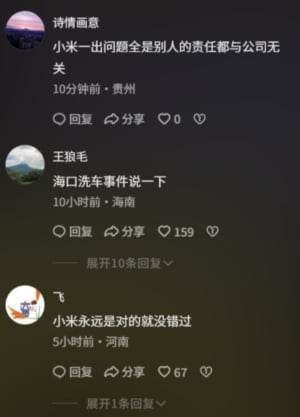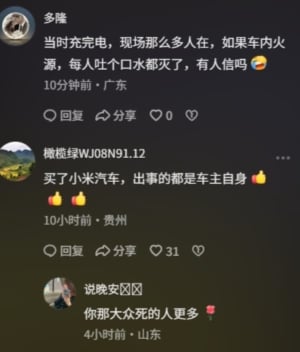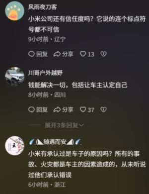 不少網民隨即在網上發帖吐槽,「小米一出問題全是別人的責任都與公司無關。」「小米永遠是對的,就沒錯過。」「小米有承認過是車子的原因嗎?所有的事故、火災都是車主的因素造成的,從未聽說過他們承認錯誤。」「當時充完電,現場那麼多人在,如果車內火源,每人吐個口水都滅了,有人信嗎?」「買了小米汽車,出事的都是車主自身。」