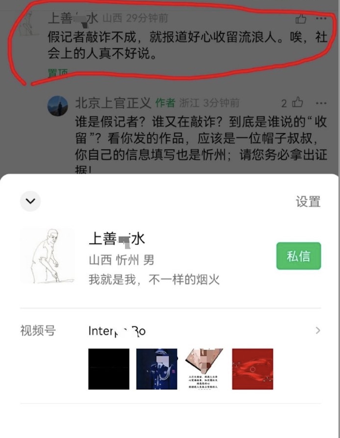 1月29日,大陸知名大家博客「上官正義」發帖表示,他因舉報忻州五台縣煤場有身份不明殘障人員做苦力,遭到一位IP地址為山西的網民「上善某水」攻擊是「假記者」「敲詐」。
