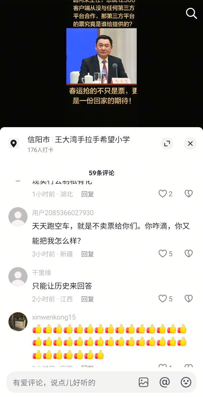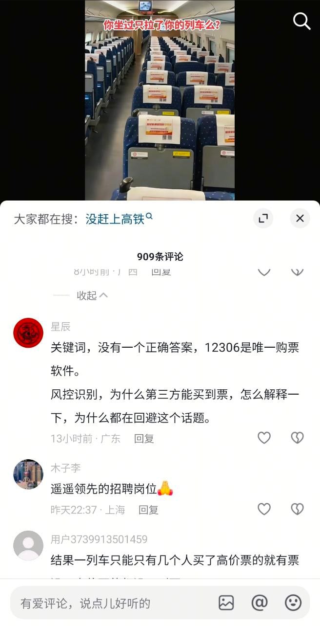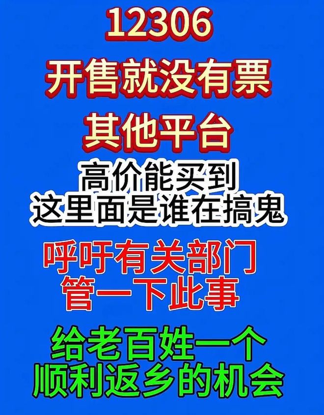 還有一位網民在網上呼籲:「12306開售就秒光,其它平台加錢就能買到,這裏面誰在搗鬼?全網呼籲有關部門管一管此事,給普通老百姓一個返鄉的車票。」