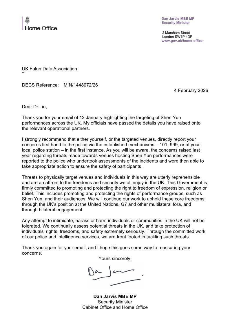 2026年2月4日,英國安全事務部長翟偉紳(Dan Jarvis)議員致函英國法輪大法學會表示,對神韻演出劇場和相關個人,實施人身攻擊的威脅行為極其惡劣,是公然侵犯英國社會所共同享有的自由與安全。